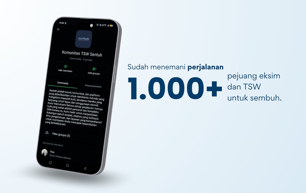 Selain itu, kamu juga bisa bergabung dengan Komunitas Teman Sentuh. Di komunitas ini, kami telah membersamai lebih dari 1.000 orang pejuang eksim dan TSW untuk bersama mencapai pemulihan holistik. Kamu bisa bergabung ke komunitas Teman Sentuh lewat pembelian produk Sentuh manapun.